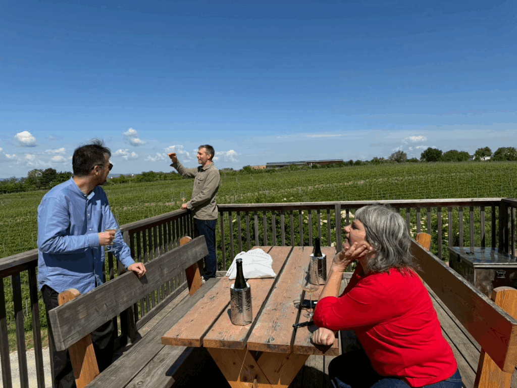 丘の上の畑へ移動するとノイジードル湖が遠目に見えるテラスがあり、ペットナットで乾杯。