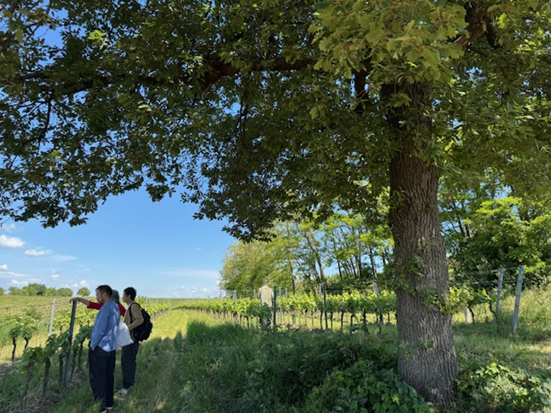 緑豊かな畑。大きな木が土壌の栄養や水分を多く取ってしまうので、木の周りのブドウは成長がゆっくりとなるのですが、木の根の周りには雨が上がった後にも水が留まっており、ブドウと共存できているとのことです。