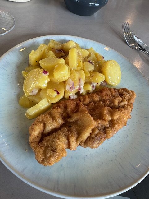 ガレージで揚げたてをいただけることに。レモンスライスを添えると、さっぱりとした味わいに。またレッドベリージャムを付けると、塩味と甘みでまた食欲が増します。同行した一成さんは3枚も完食。私は2枚で満腹でした。シュニッツェルに添えたポテトマリネもジャガイモの味が濃かったです。