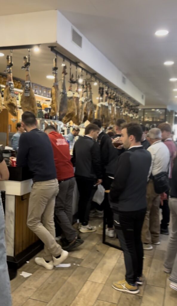 ▲原木の生ハムがすだれのように吊り下がったカウンターは、立ち飲みの人で溢れています
