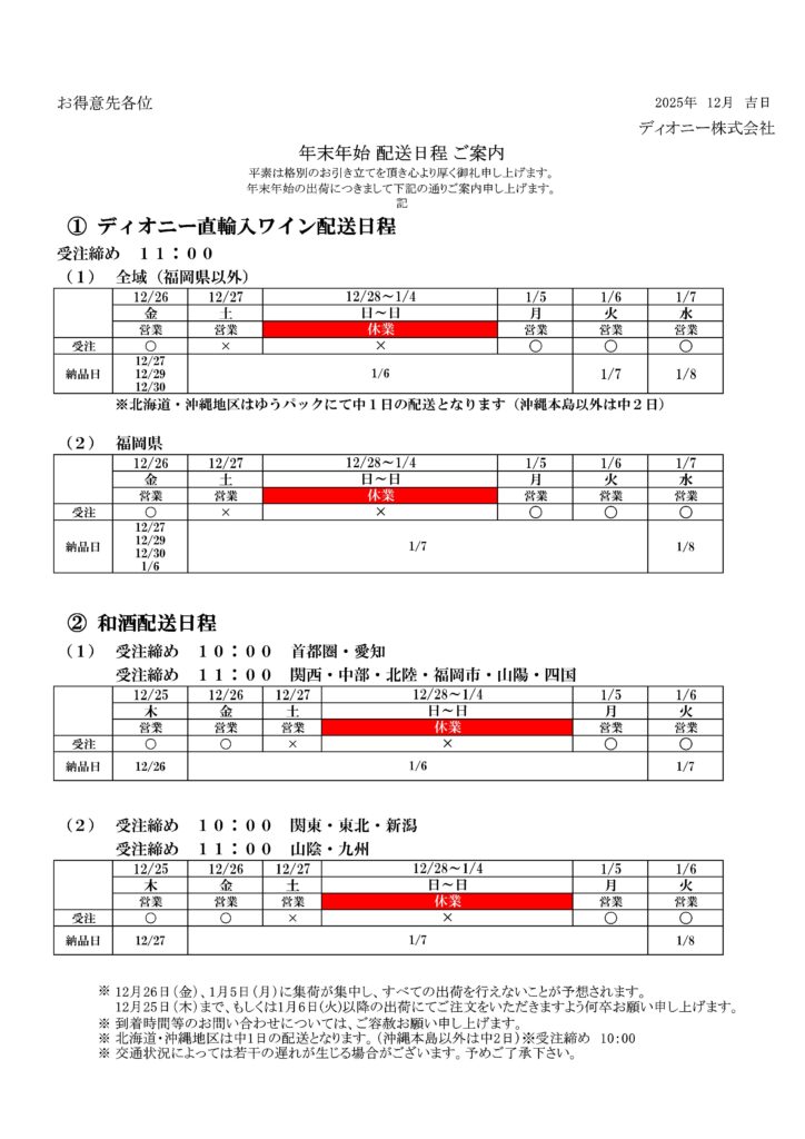 お知らせ ナチュラルワイン 國酒 食品 年末年始配送日程のご案内 2025.12.05 平素は格別のご高配を賜り、厚く御礼申し上げます。弊社、冬季休暇に伴う配送日程をご案内致します。 ご不便をお掛け致しますが、ご理解・ご協力の程お願い申し上げます。 ※緊急時のご連絡は、各担当営業までお願い致します。 一覧へ戻る ホームお知らせ年末年始配送日程のご案内
