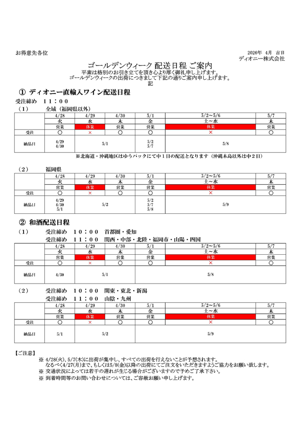 お知らせ ナチュラルワイン、國酒、食品 ゴールデンウィーク配送日程の案内 2026.04.02 平素は格別のご高配を賜り、厚く御礼申し上げます。弊社、ゴールデンウィークに伴う配送日程をご案内致します。 ご不便をお掛け致しますが、ご理解・ご協力の程お願い申し上げます。 ※緊急時のご連絡は、各担当営業までお願い致します。 一覧へ戻る ホームお知らせゴールデンウィーク配送日程の案内